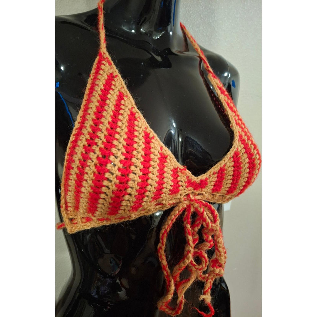 Mustard yellow and red bikini top fit for an A to small B cup! Ties to fit, come get her!